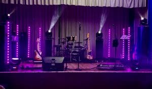 This is an example of upscaled production which brings in additional moving head and truss fixtures along side our staging. Take a look at the add ons page for current pricing.